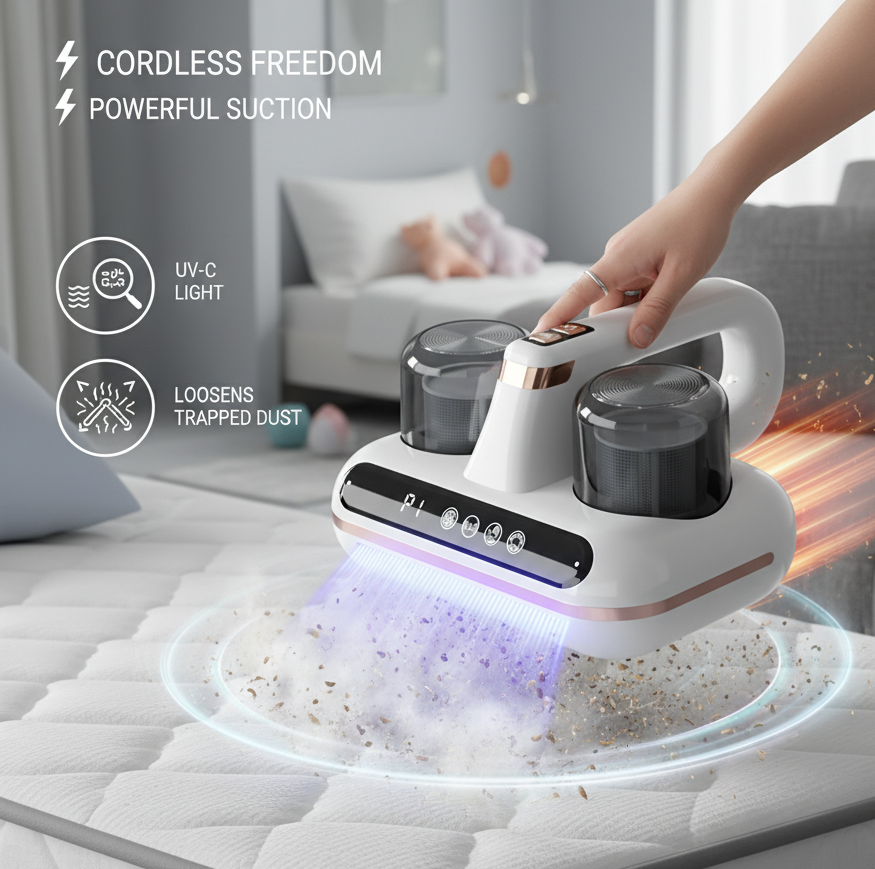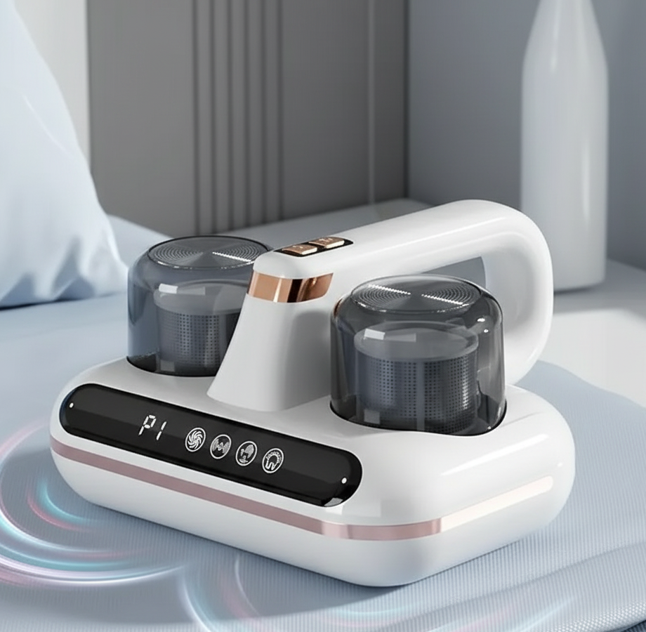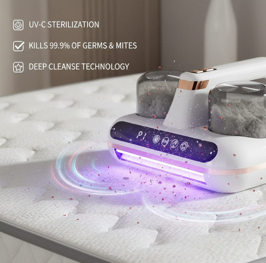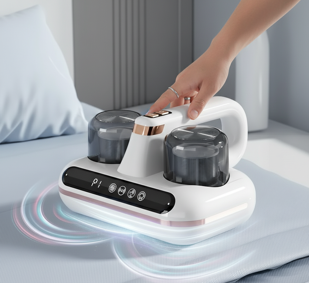 Simplemente enciende el aspirador, selecciona el modo (Suave, Estándar o Turbo) y deslízalo sobre colchones, sofás y almohadas. Succión potente, luz UV y calor esterilizan y eliminan el 99.9% de los ácaros, dejando tus superficies higienizadas en minutos.