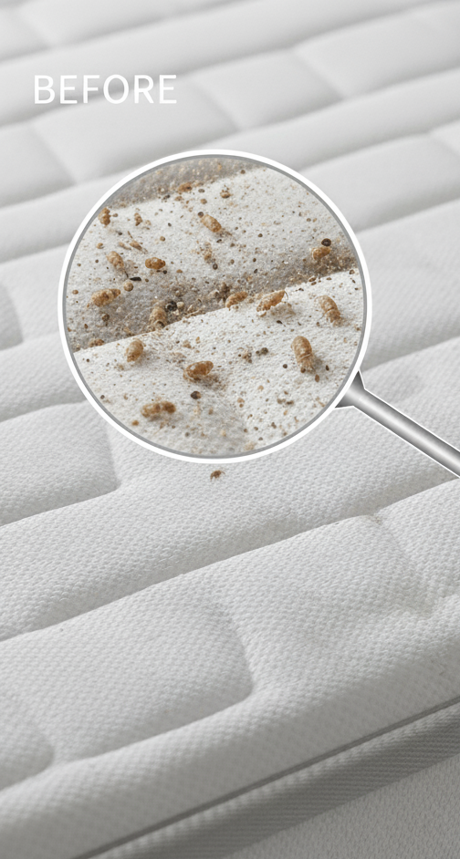 Luz UV + calor a 55°C eliminan el 99.99% de ácaros y bacterias.